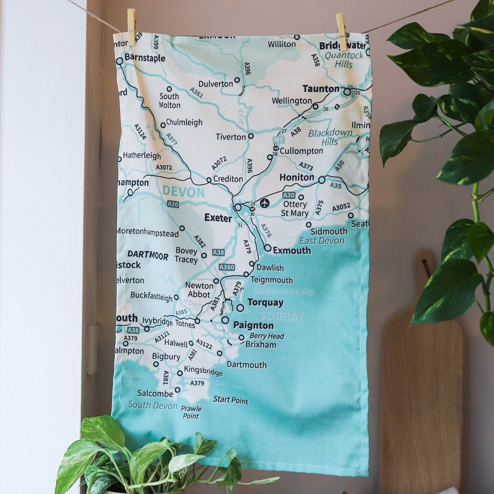 This Devon themed tea towel features a colourful blue map of the coastline and surrounding areas, including Teignmouth where The Drifting Bear Co. was founded.