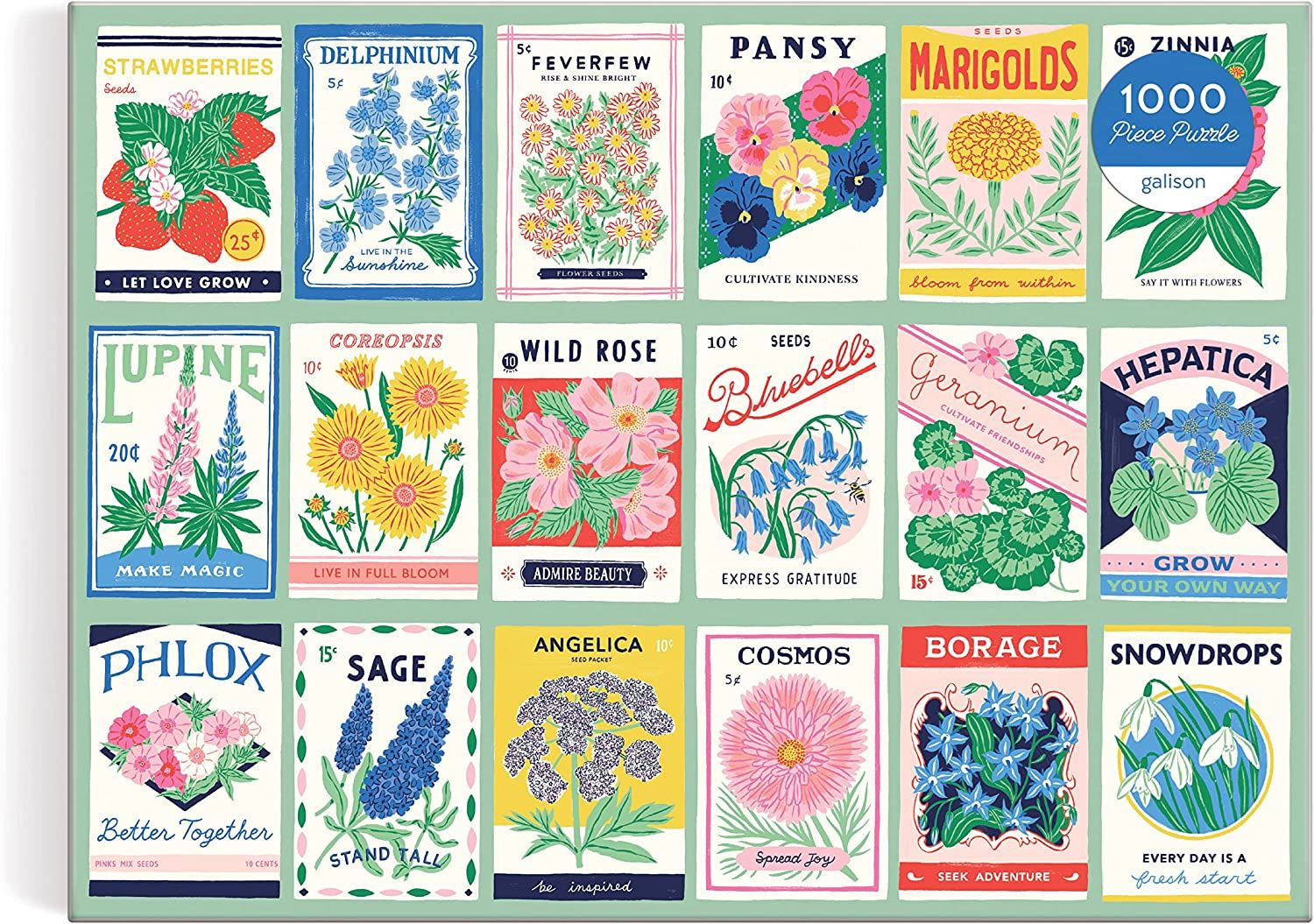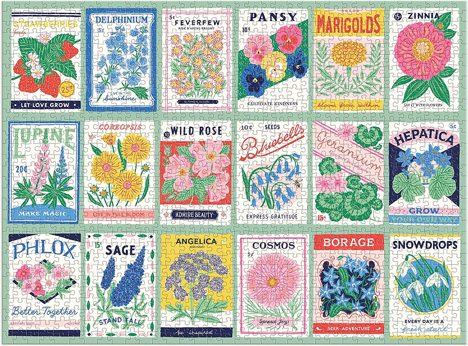 This 1000-piece jigsaw puzzle draws inspiration from vintage seed packaging. Includes colour poster for reference. Box Size: 86 x 210 x 51 mm (11.25 x 8.25 x 2"). Puzzle Size: 508 x 686 mm (27 x 20"). Puzzle greyboard contains 90% recycled paper. Packaging contains 70% recycled paper and is made responsibly from FSC-certified material. Printed with nontoxic inks. This 1000-piece jigsaw puzzle draws inspiration from vintage seed packaging. Includes colour poster for reference. Box Size: 86 x 210 x 51 mm (11.25 x 8.25 x 2"). Puzzle Size: 508 x 686 mm (27 x 20"). Puzzle greyboard contains 90% recycled paper. Packaging contains 70% recycled paper and is made responsibly from FSC-certified material. Printed with nontoxic inks.