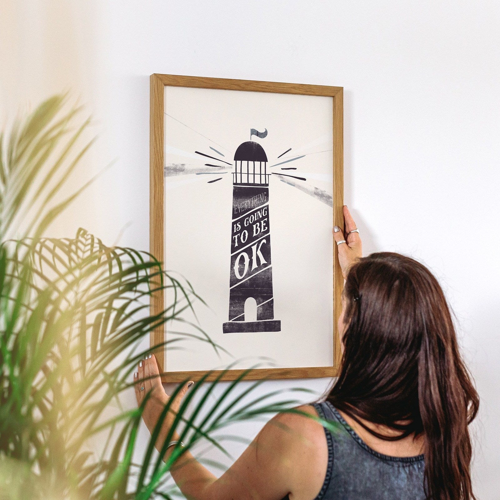 A nautical screen-print style design, featuring a shining lighthouse and the words 'Everything Is Going To Be Ok' .