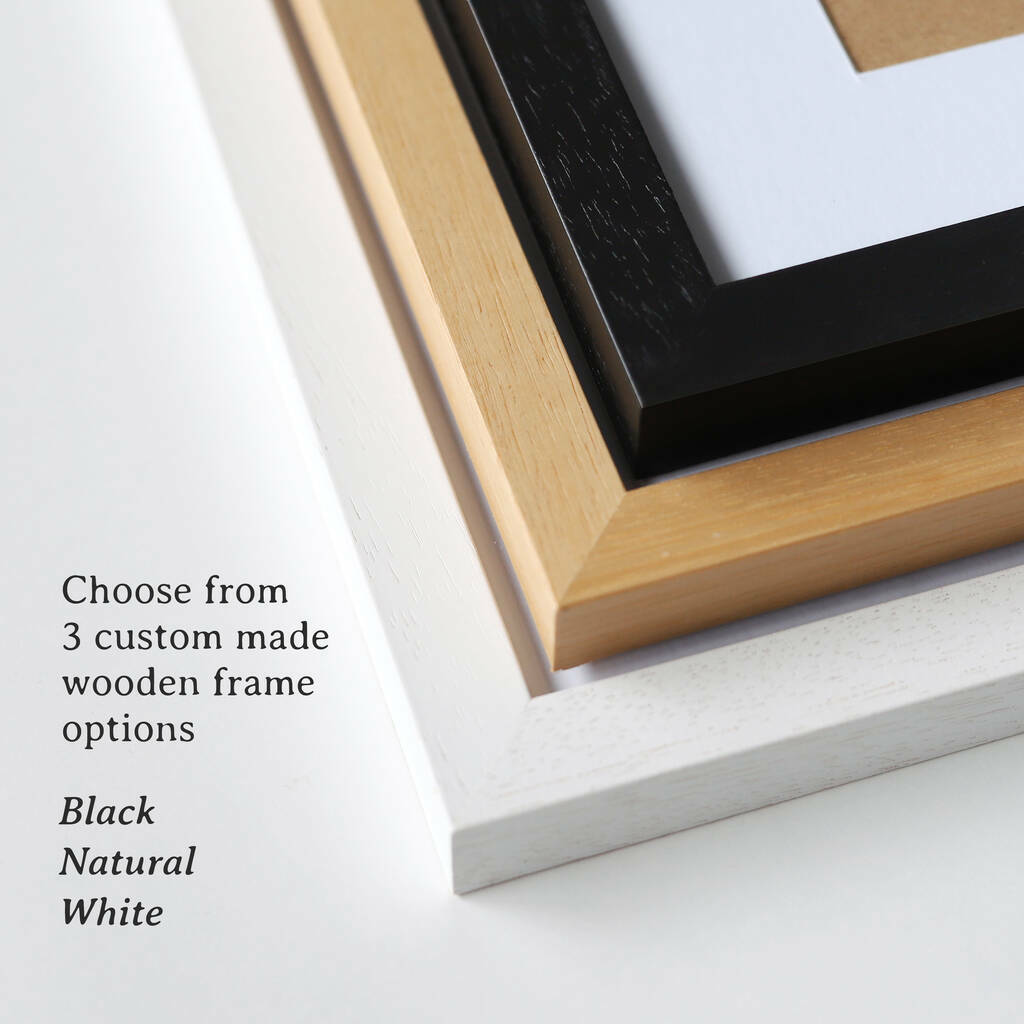 We offer a variety of framing options. Please see the product images to view the different frame styles, or choose ‘unframed’ if you wish to frame the print yourself.