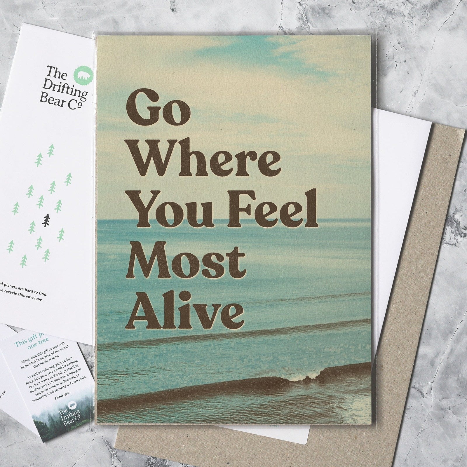 This feel-good print features a peaceful ocean image and the words 'Go Where You Feel Most Alive'.