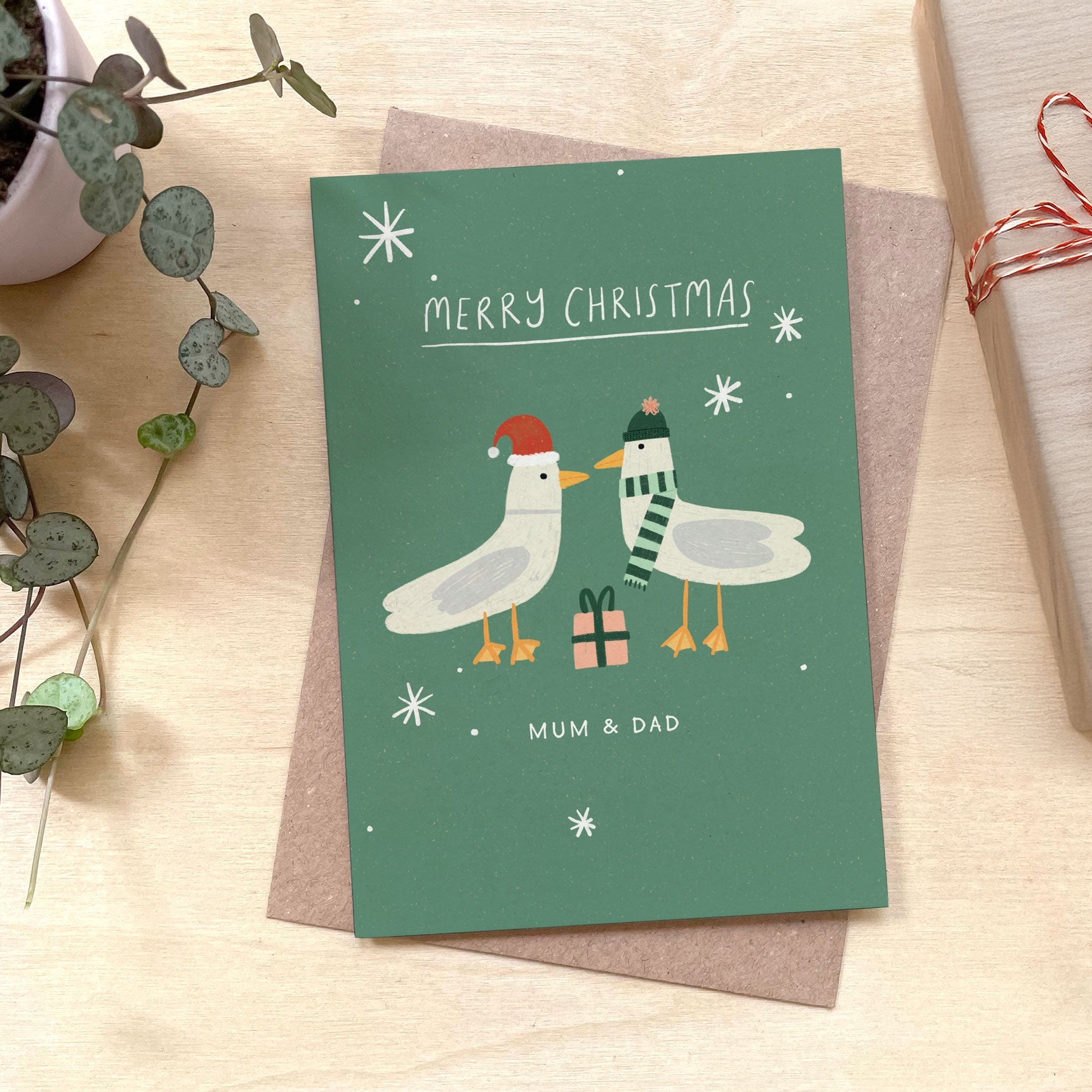 Mum & Dad Seagull Christmas Recycled Coffee Cup Card