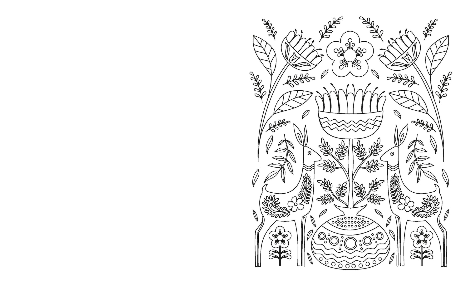 Scandinavian folk art is renowned for its whimsical designs, vibrant colours and pleasing patterns. The designs in this colouring book reflect traditions which involve painting intricate designs, floral motifs, and geometric patterns on furniture, woodenware and household items, as well their appearance in embroidery and other textile arts. These traditional patterns include flowers, birds and animals, and more abstract designs. All you need are a few pencils or markers and your imagination. Includes 40 designs printed on single-sided pages and thick, high-quality paper.