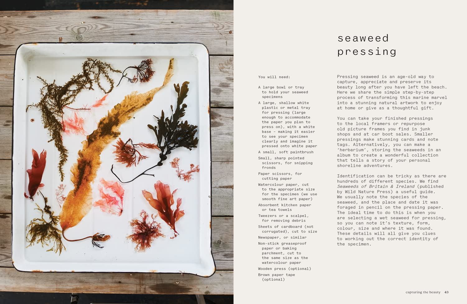The book is packed with glorious photography of the UK coastlines where the seaweeds can be foraged, alongside stylish interiors, and scenes of beach cook-outs and wild swimming spots. It also includes a library of pressed seaweeds presented in colour categories, with notes for identification and use. There is expert guidance on collecting seaweeds, and it will show how foraged seaweeds can be used at home for cooking, dyeing and printing fabrics, and as part of your skincare routine.