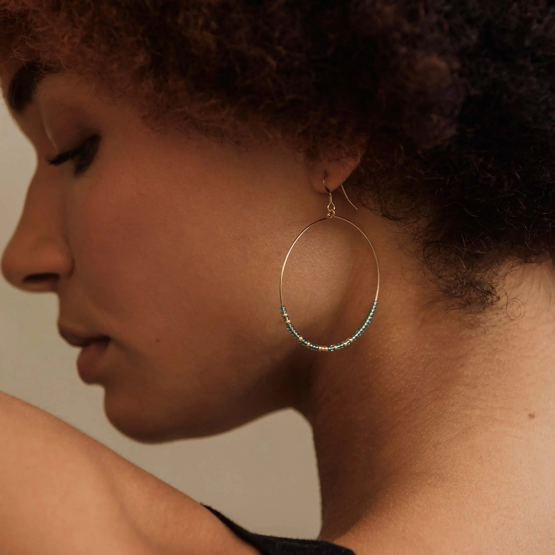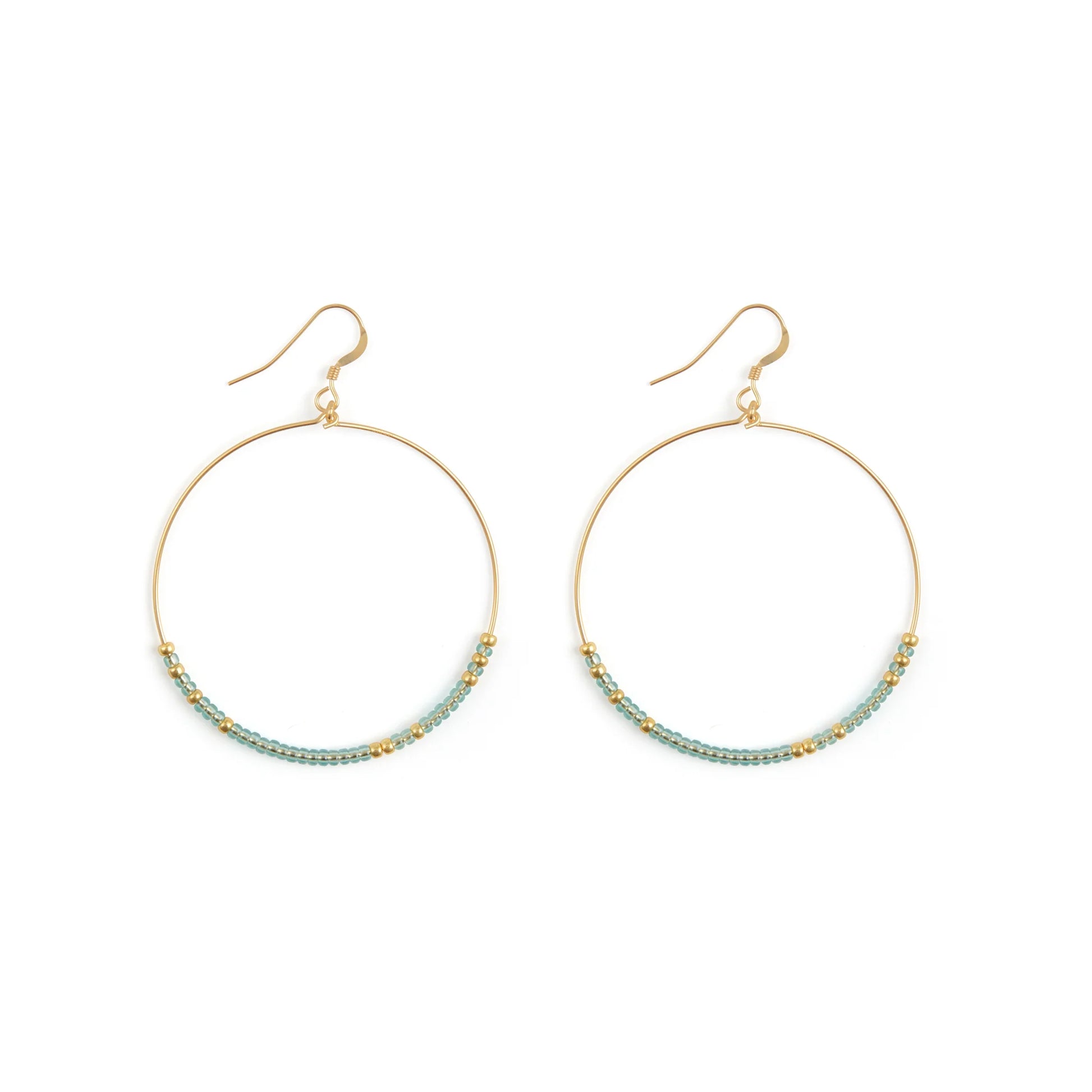 Dropping from gold hooks, Lido earrings feature hoops strung with translucent aqua and gold glass seed beads. The colours and climate of North Africa inspired the latest beaded jewellery additions to this collection.